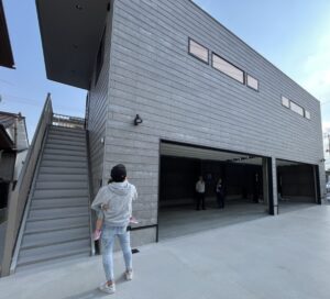 今回の建物は、外観は落ち着いたグレーのサイディングと木目調のシャッターで統一感を持たせ、シンプルながらも存在感ある仕上がりに。